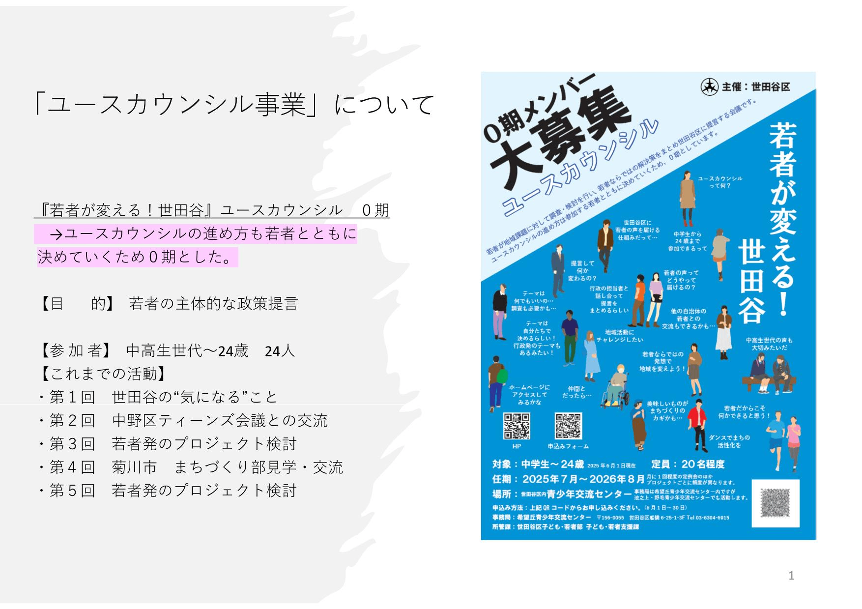 世田谷区ユースカウンシルは令和7年7月から活動をスタートさせ、月1回程度の定例会や、若者が自由に集まり、世田谷区の課題について議論したり、他自治体と交流を行ったりしています。今後ユースカウンシルの活動の中で出た課題などについて意見聴取を実施していく予定です。